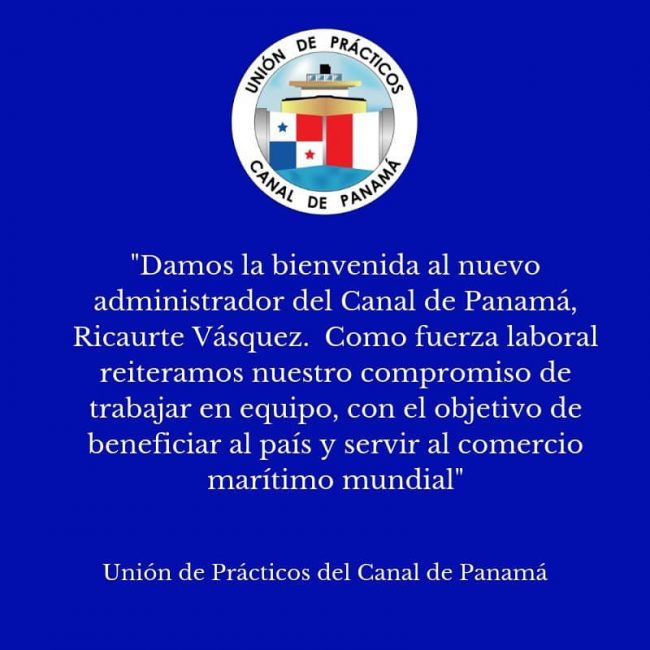 En la Unión de Prácticos del Canal de Panamá le damos la bienvenida al nuevo administrador del Canal de Panamá, Ricaurte Vásquez. Como fuerza laboral reiteramos nuestro compromiso de trabajar en equipo, con el objetivo de beneficiar al país y servir al comercio marítimo mundial.